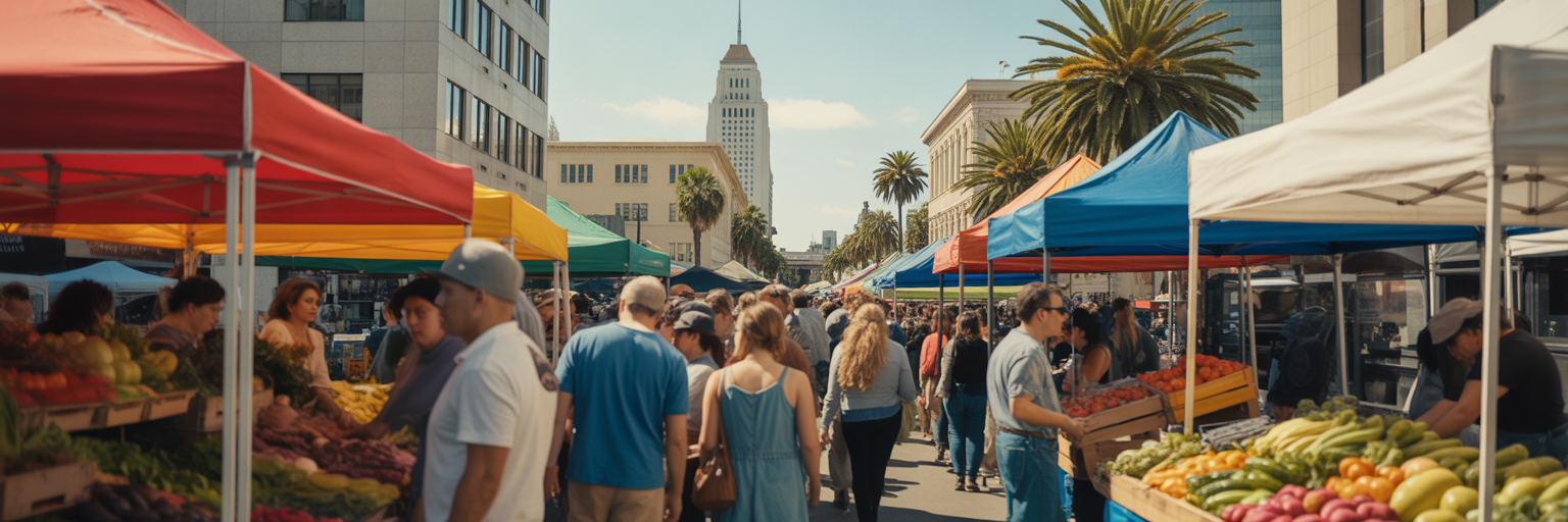 Bustling crowd at a sunny Los Angeles farmers market.